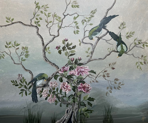 Jane Willoughby is a decorative artists specialising in large-hand painted murals. With an honours degree in Art History and a background in interior design, Jane worked for many years as a decorative painter, completing large-scale painted interior schemes on a commissioned basis before settling down to specialise in canvas panels that she paints from her studio in Dun Laoghaire, Co. Dublin. Panels measure on average 120cm x 100cm and are inspired by historical interior painted decoration, from Chinese hand painted wallpaper to antique Japanese prints of French and Dutch inspired floral motifs. With a soft muted colour palette these timeless original arworks feature flowing stylised botanical themes including leaves, flowers and birds in harmonious compostions that are distinctively her own.